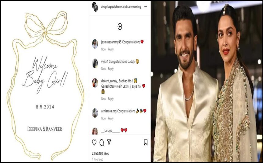 ممبئی (شوبز ڈیسک): بالی وڈ کی معروف جوڑی دیپیکا پڈوکون اور رنویر سنگھ کے گھر بیٹی کی پیدائش ہوئی ہے۔اداکار جوڑے کی جانب سے فوٹو وینڈی ویڈیو شیئرنگ ایپلی کیشن انسٹاگرام پر بیٹی کی آمد کا اعلان کیا گیا۔سوشل میڈیا پوسٹ کے مطابق رنویر اور دیپیکا کے ہاں بیٹی کی پیدائش 8 ستمبر یعنی اتوار کی صبح ہوئی۔