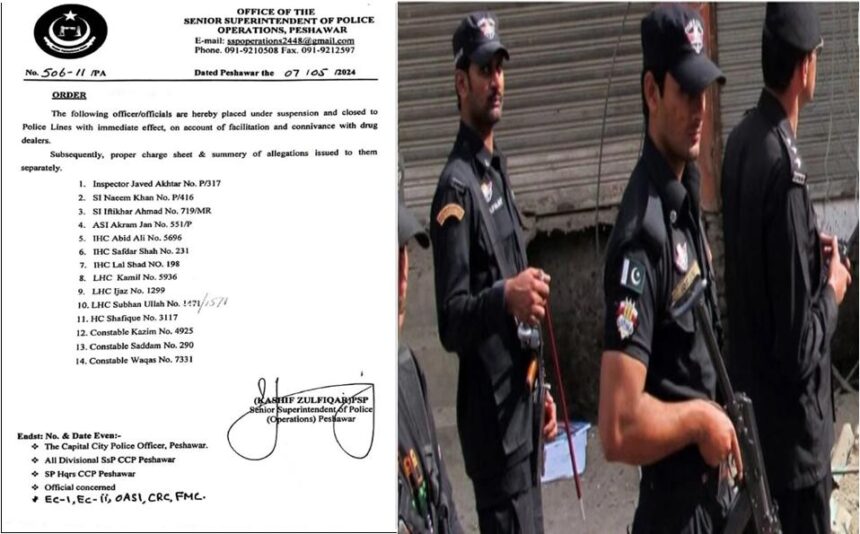 پشاور (ویب ڈیسک): پشاورپولیس میں منشیات اسمگلروں کی سہولت کاری کا انکشاف ہوا ہے۔ایس ایس پی آپریشنز نے منشیات اسمگلروں کی سہولت کاری پر پولیس افسر سمیت 14 اہلکاروں کو معطل کر دیا ہے، معطل ہونے والوں میں ایس ایچ او، ایڈیشنل ایس ایچ او ، دو چوکی انچارج اور پولیس کانسٹیبلز شامل ہیں۔