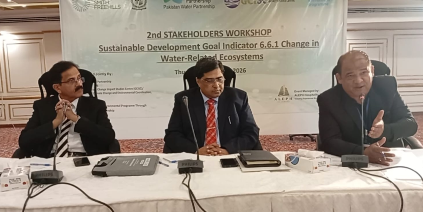 اسلام آباد (ویب ڈیسک): پاکستان واٹر پارٹنرشپ (PWP) نے گلوبل چینج امپیکٹ اسٹڈیز سینٹر (GCISC) کے اشتراک سے پانی سے متعلقہ ماحولیاتی نظام (Freshwater Ecosystems) کے تحفظ اور بحالی کے لیے ایس ڈی جی 6.6.1 کے تحت دوسرا قومی اسٹیک ہولڈر مشاورتی ورکشاپ اسلام آباد میں منعقد کیا۔ ورکشاپ میں سرکاری اداروں، ماہرین، سول سوسائٹی، تعلیمی اداروں اور نجی شعبے کے نمائندوں نے شرکت کی اور پاکستان کے آبی ماحولیاتی نظام کے تحفظ کے لیے حکمت عملیوں پر تبادلہ خیال کیا۔
